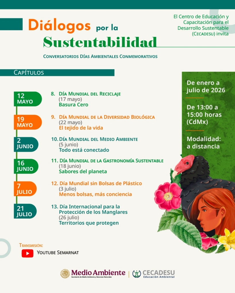 La SEMARNAT extiende la invitación a participar en el programa “Diálogos por la Sustentabilidad”, una serie de conversatorios enmarcados en los Días Ambientales Conmemorativos.